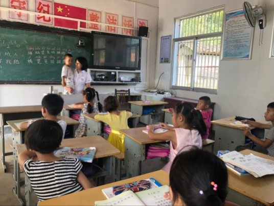 其实这位老师抱的是班里的学生,今年刚上幼儿园中班,因为这个学校只有一个老师一个班,这个班总共11个学生,却有幼儿园中班、大班、小学一二三年级……