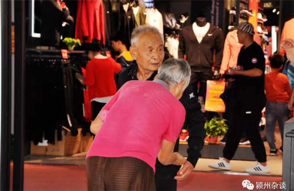 由于爱好摄影,闲暇的时候,总爱带着相机到处转转。这个国庆,在阜阳市百货大楼,我看见一对老年夫妇在三楼运动区域购物。说起来,在商场里,购物可算是常见的情景,但这一对老人从挑选服装、到试穿、再到付款的整个过程,让人真正体会到了什么叫相濡以沫。