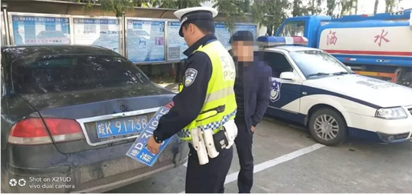 2018年11月9日10时许,阜阳市交警二大队宁老庄交警中队民警通过缉查布控系统预警发现,有一辆涉嫌报废的轿车正在路上行驶。