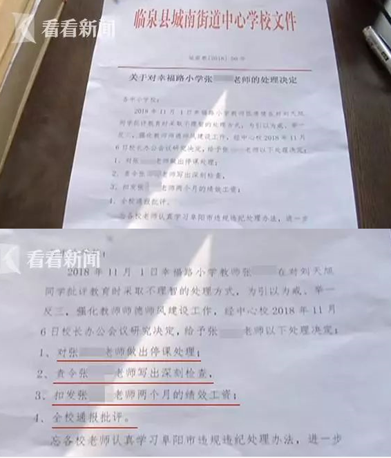 临泉县教育局负责人:“张某某的检讨书都写了几页了 ,我们都看了,老师已经认识了错误过了。”